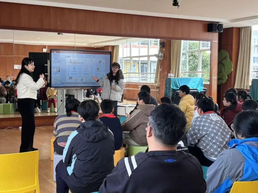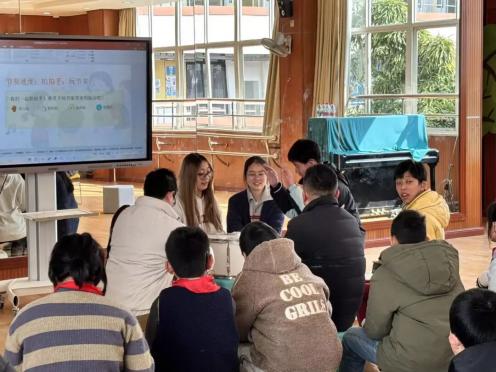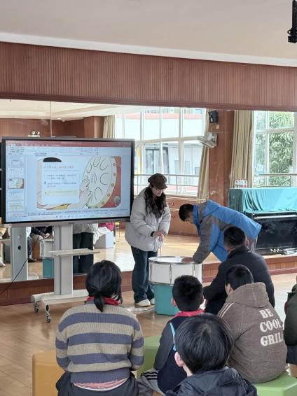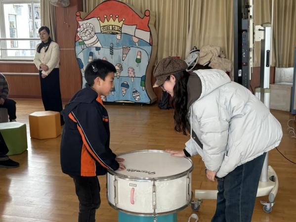 当音乐响起,音乐跃动训练环节让现场氛围愈发热烈。团队同学们带领孩子们跟随音乐节奏,配合鼓、铃等乐器的节拍进行肢体律动,抬手、踏步、摆身…… 孩子们用身体感知音乐的节奏与韵律,在跃动中体会音乐与语言的奇妙交互,享受旋律带来的快乐。
